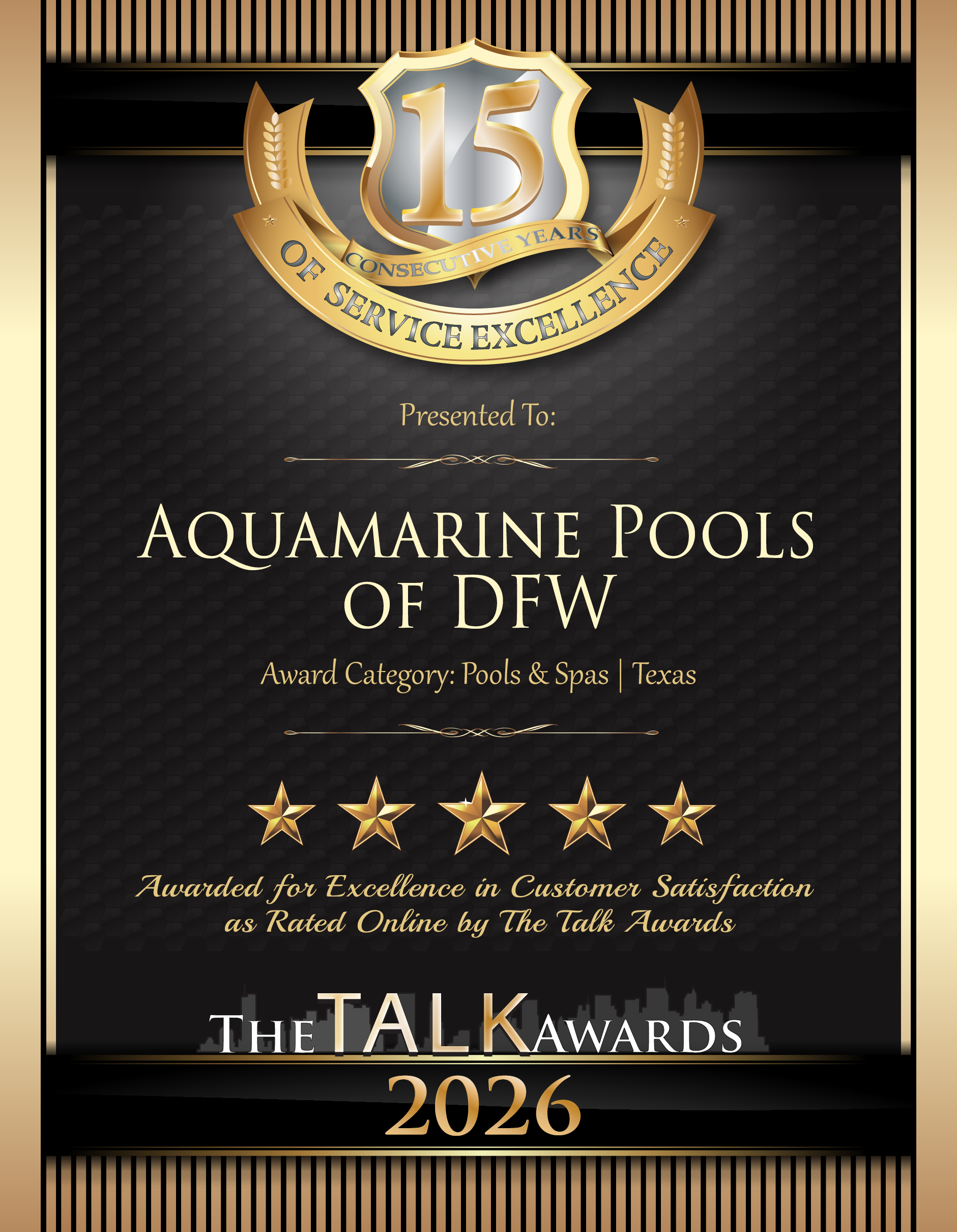 The Talk Awards congratulate those companies that are committed to making their customers experience the best it can be. For its dedication to providing excellent customer service, Aquamarine Pools of DFW of Alvarado, Texas has won The Talk Award for customer satisfaction.