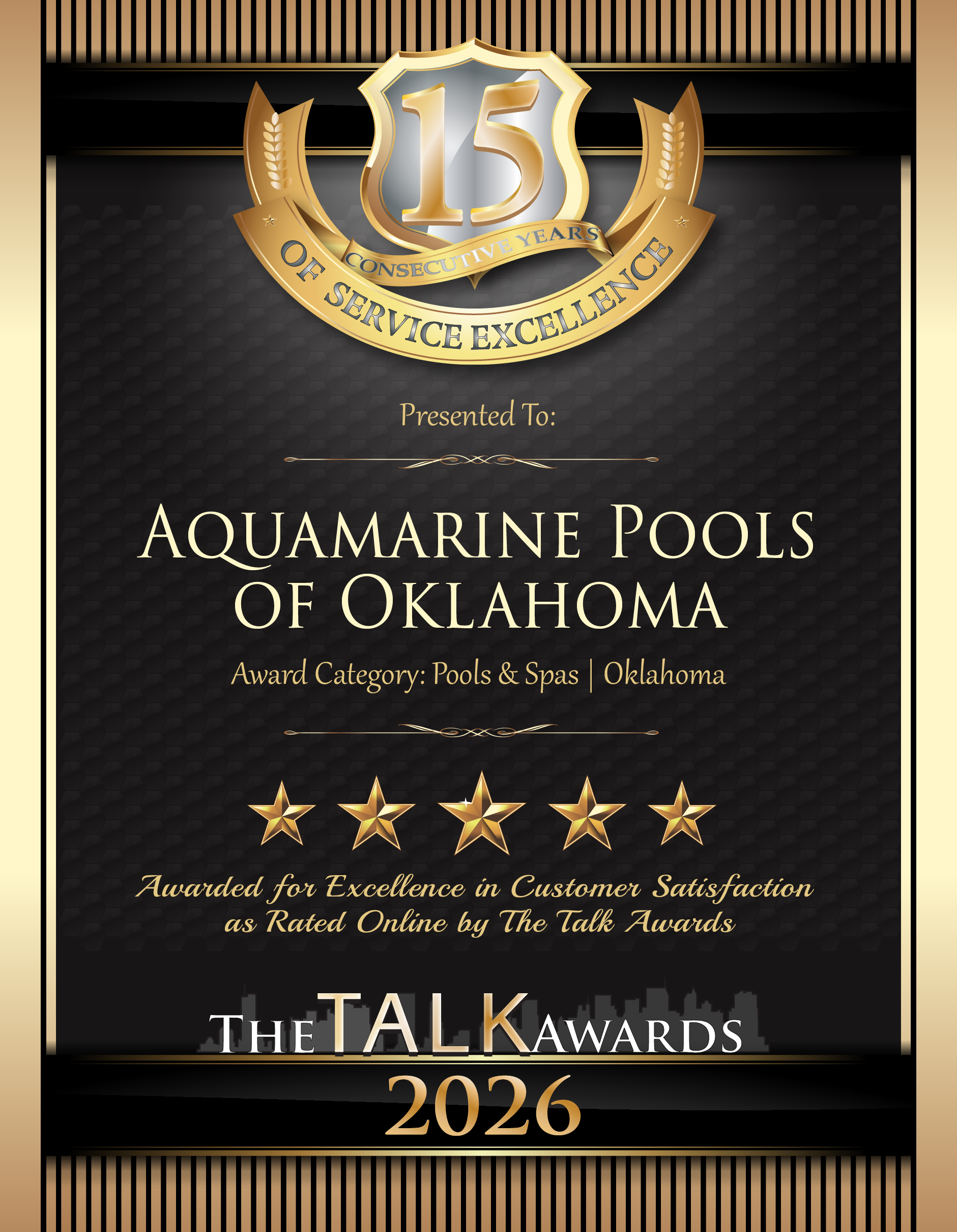 The Talk Awards congratulate those companies that are committed to making their customers experience the best it can be. For its dedication to providing excellent customer service, Aquamarine Pools of Oklahoma of Pauls Valley, Oklahoma has won The Talk Award for customer satisfaction.