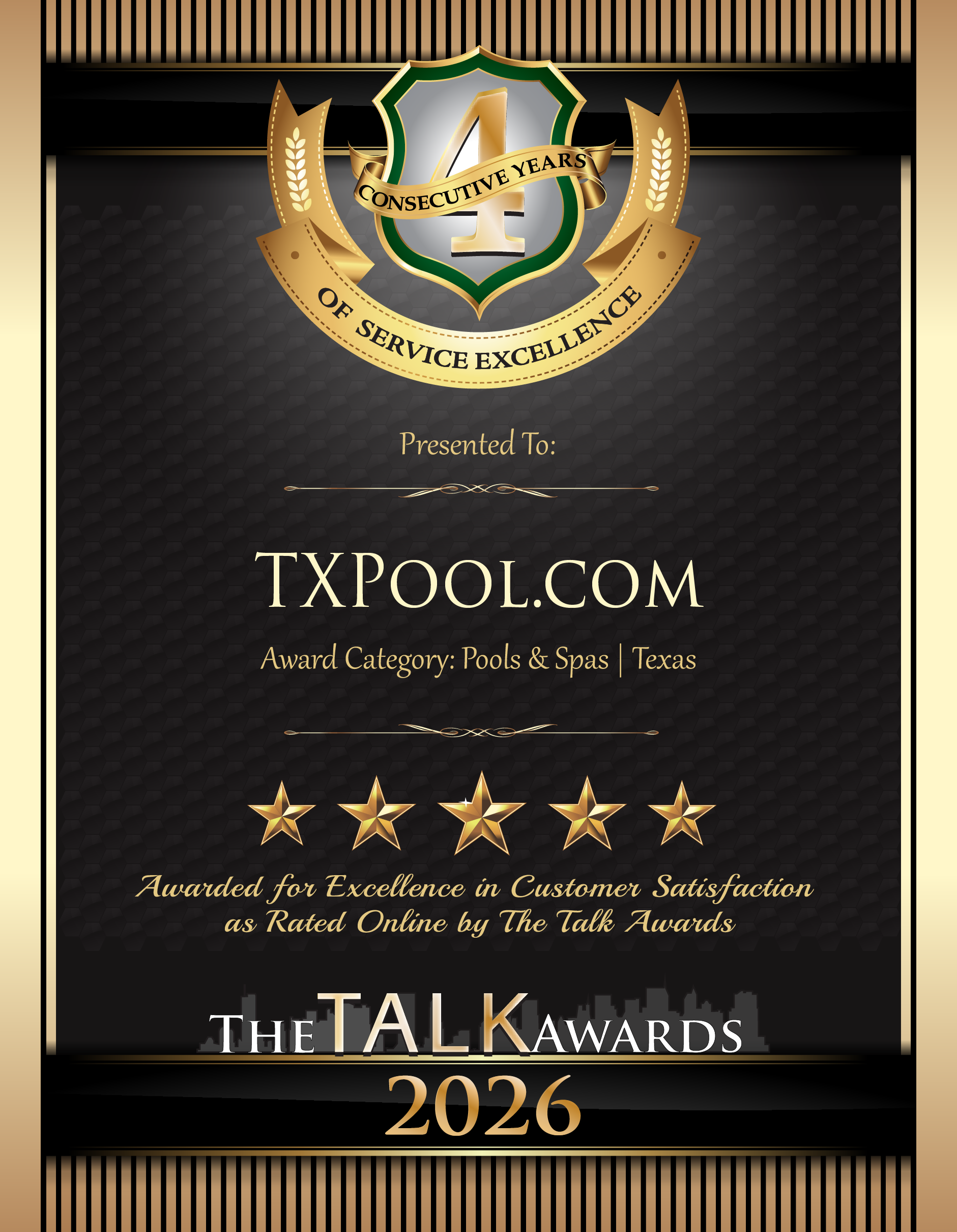 The Talk Awards congratulate those companies that are committed to making their customers experience the best it can be. For its dedication to providing excellent customer service, TXPool.com of Fort Worth, Texas has won The Talk Award for customer satisfaction.
